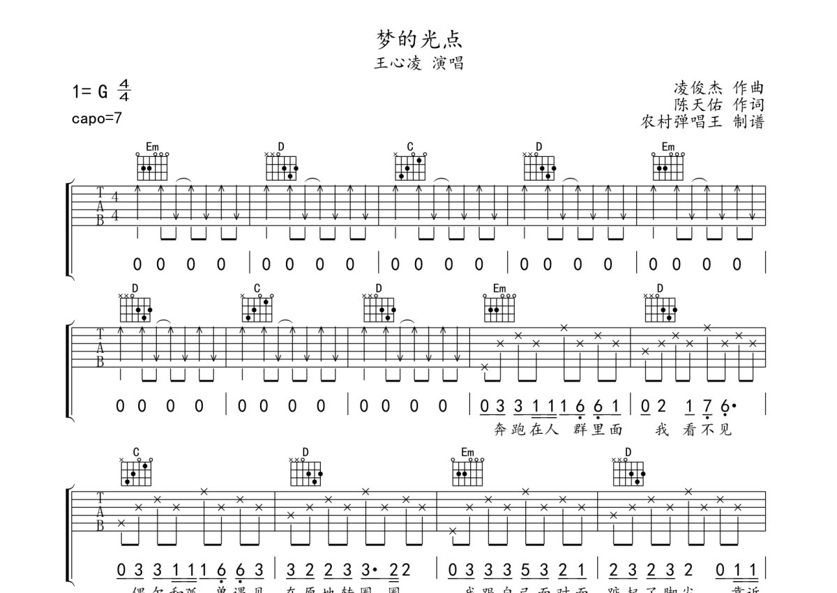 《梦的光点》是王心凌演唱的一首歌曲,本吉他谱采用的是G调指法编配,这份吉他谱共有两张高清图谱,图谱由 @农村弹唱王 编配上传,图谱使用六线谱编配,包含吉他和弦指法、简谱以及歌词部分,使用这份梦的光点吉他谱,可以让你更加方便地掌握这首歌曲的弹唱技巧,快来尝试吧。本谱采用G调和弦指法编配,节奏为4/4拍,速度为85拍每分钟,原调女生夹7品,男生建议夹5品。也可以根据个人嗓音找到一个舒服的位置,难度简单。