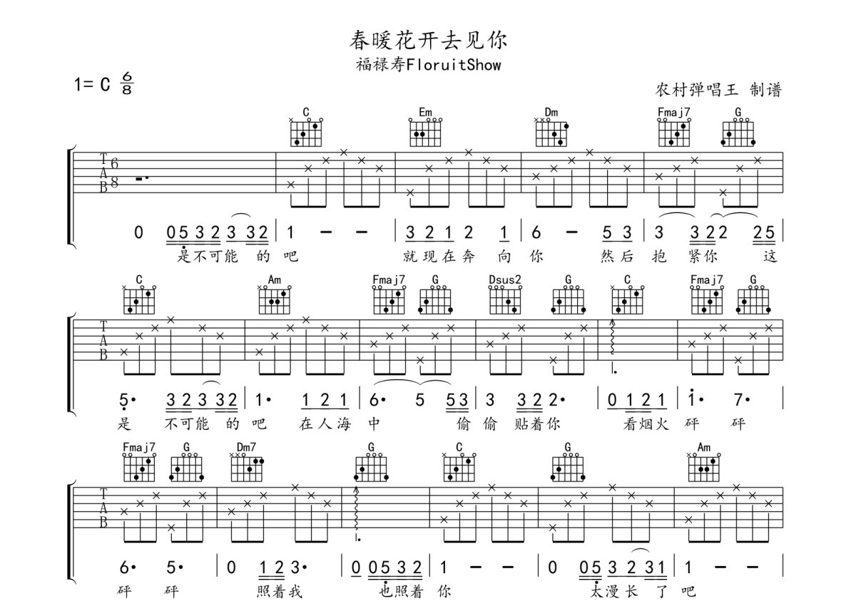 《春暖花开去见你》是福禄寿FloruitShow演唱的一首歌曲,本吉他谱采用的是C调指法编配,这份吉他谱共有两张高清图谱,图谱由 @农村弹唱王 编配上传,图谱使用六线谱编配,包含吉他和弦指法、简谱以及歌词部分,使用这份春暖花开去见你吉他谱,可以让你更加方便地掌握这首歌曲的弹唱技巧,快来尝试吧。福禄寿FloruitShow演唱的【春暖花开去见你】,用一种清新的曲调,将内心的小期待,娓娓道来。没有狂躁不安的阴郁,没有热烈爆炸的奔放,却让听众不自觉嘴角上扬,就像是与那个心心念念的人即将相见。只要不停地想念,一定会等到云开雨收,春暖艳阳。只要不停地想念,天上的星星就不会熄灭,因为那是我内心的希冀,我们一定会相见。本谱采用C调指法,不夹变调夹,男生建议夹6品。节奏为6/8拍,简单易弹。