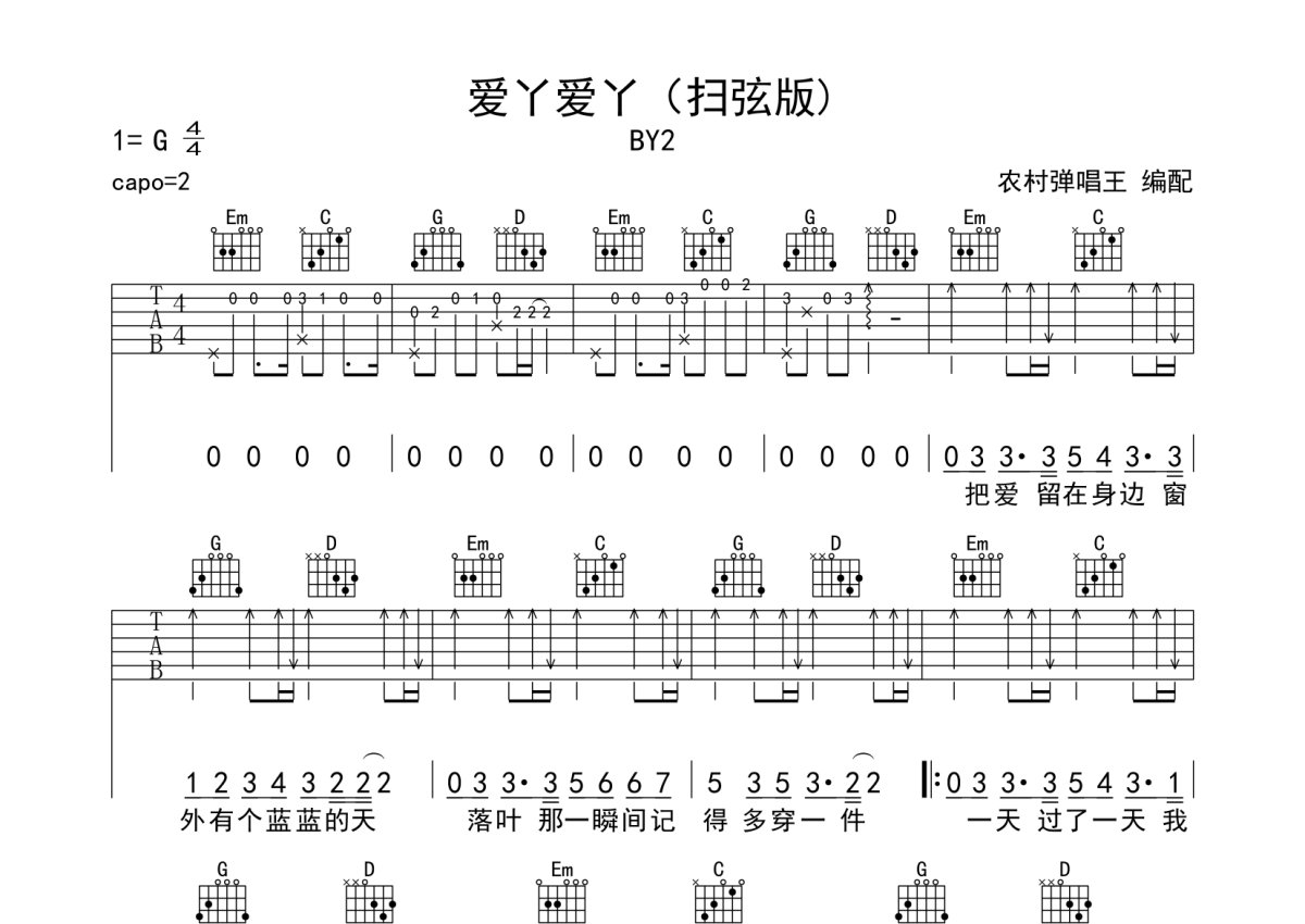 BY2《爱丫爱丫》吉他谱 - G调弹唱六线谱 - 扫弦版