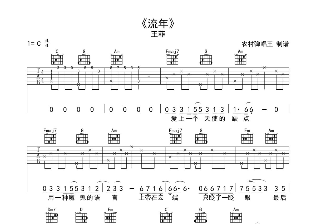 王菲《流年》吉他谱 - C调弹唱六线谱
