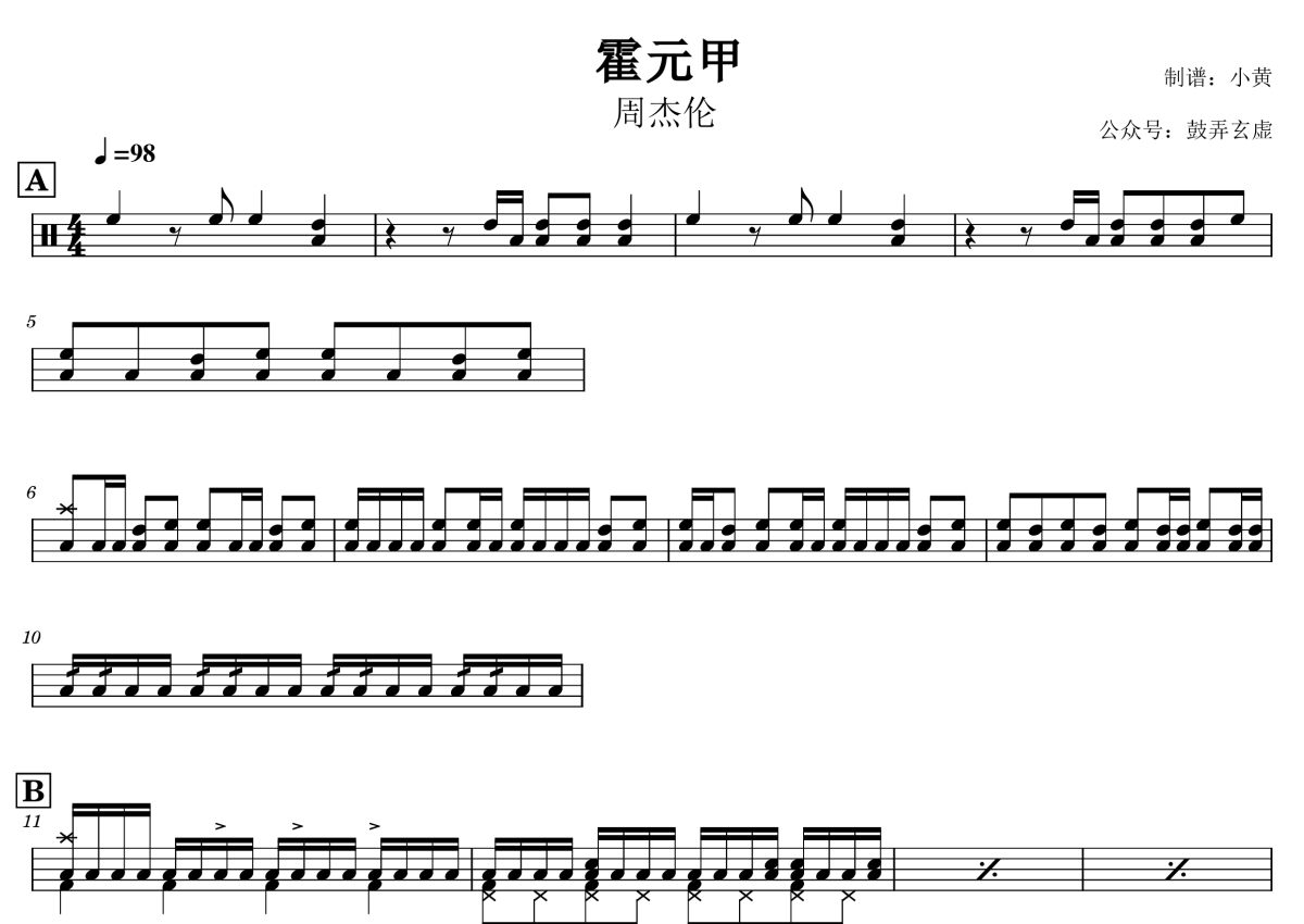 《霍元甲》是周杰伦演唱的一首歌曲,这份鼓谱共有三张高清图谱,图谱由 @小黄 编配上传,图谱使用五线谱编配,使用这份霍元甲架子鼓谱,你将能够轻松地敲打出这首周杰伦的霍元甲,快来尝试吧。周杰伦《霍元甲》架子鼓谱,小黄编配出品,共有3张高清图谱。