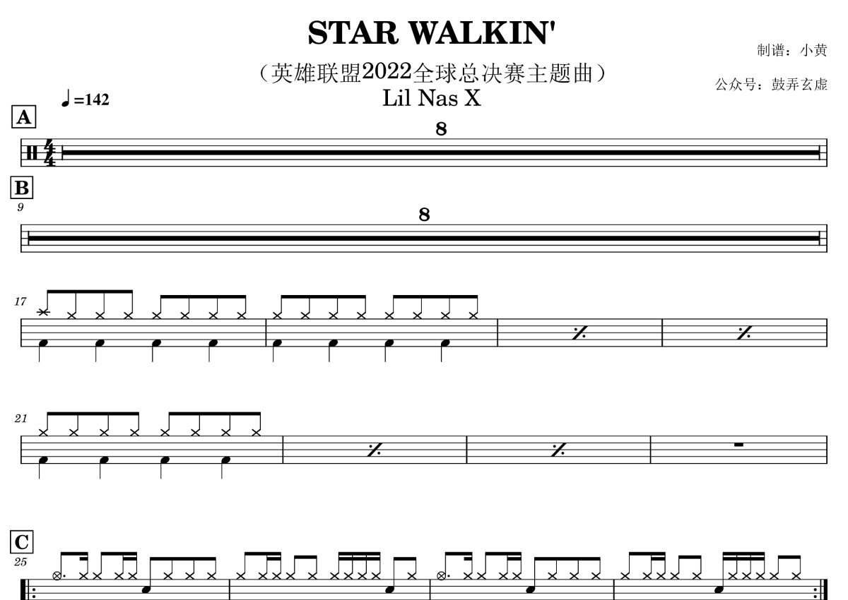 Lil Nas X《STAR WALKIN'》鼓谱 - 架子鼓谱 - 英雄联盟2022全球总决赛主题曲