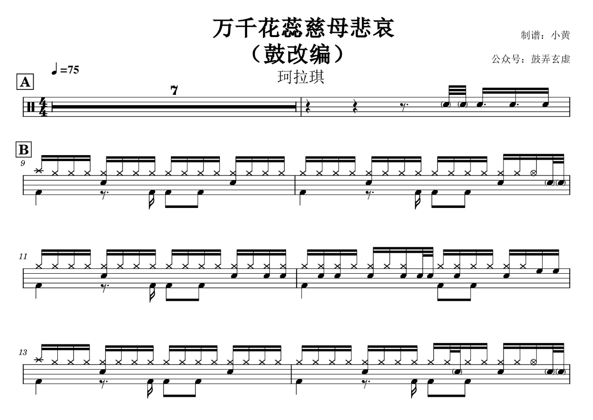 《万千花蕊慈母悲哀》是珂拉琪演唱的一首歌曲,鼓改编版,这份鼓谱共有三张高清图谱,图谱由 @小黄 编配上传,图谱使用五线谱编配,使用这份万千花蕊慈母悲哀架子鼓谱,你将能够轻松地敲打出这首珂拉琪的万千花蕊慈母悲哀,快来尝试吧。珂拉琪《万千花蕊慈母悲哀》架子鼓谱鼓改编版,小黄编配出品,共有3张高清图谱。