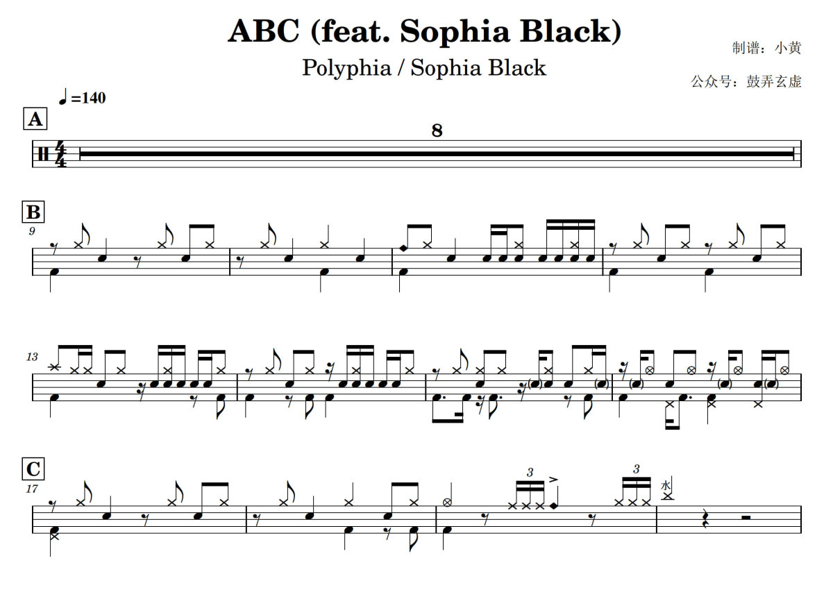 《ABC (feat. Sophia Black)》是Polyphia / Sophia Black演唱的一首歌曲,这份鼓谱共有四张高清图谱,图谱由 @小黄 编配上传,图谱使用五线谱编配,使用这份ABC (feat. Sophia Black)架子鼓谱,你将能够轻松地敲打出这首Polyphia / Sophia Black的ABC (feat. Sophia Black),快来尝试吧。Polyphia/SophiaBlack《ABC(feat.SophiaBlack)》架子鼓谱,小黄编配出品,共有4张高清图谱。