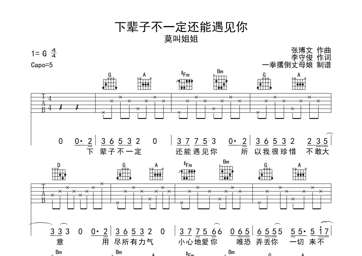 莫叫姐姐《下辈子不一定还能遇见你》吉他谱 - G调弹唱六线谱