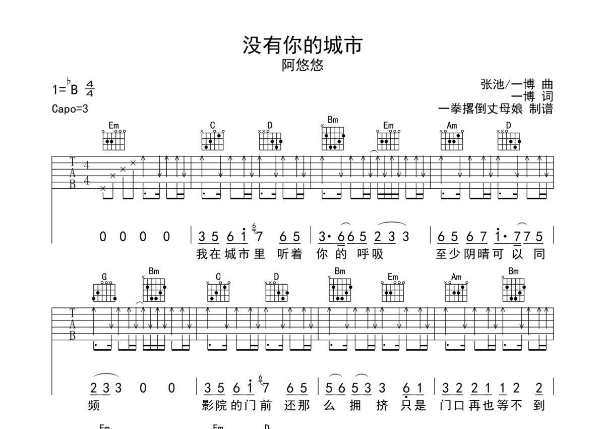 《没有你的城市》是阿悠悠演唱的一首歌曲,本吉他谱采用的是G调指法编配,这份吉他谱共有三张高清图谱,图谱由 @坐摇椅听大戏 编配上传,图谱使用六线谱编配,包含吉他和弦指法、简谱以及歌词部分,使用这份没有你的城市吉他谱,可以让你更加方便地掌握这首歌曲的弹唱技巧,快来尝试吧。阿悠悠《没有你的城市》吉他谱_G调吉他弹唱谱。