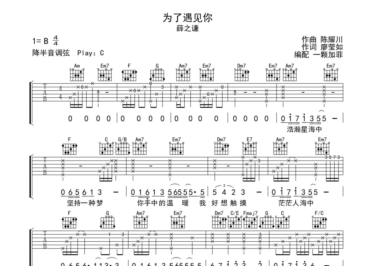 薛之谦《为了遇见你》吉他谱 - C调弹唱六线谱 - 完整编配版