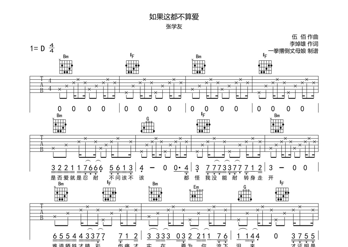 《如果这都不算爱》是张学友演唱的一首歌曲,本吉他谱采用的是D调指法编配,这份吉他谱共有两张高清图谱,图谱由 @坐摇椅听大戏 编配上传,图谱使用六线谱编配,包含吉他和弦指法、简谱以及歌词部分,使用这份如果这都不算爱吉他谱,可以让你更加方便地掌握这首歌曲的弹唱技巧,快来尝试吧。张学友《如果这都不算爱》吉他弹唱谱,采用D调指法编配,一拳撂倒丈母娘制谱编配出品,共有2张高清图谱,免翻页排版设计。