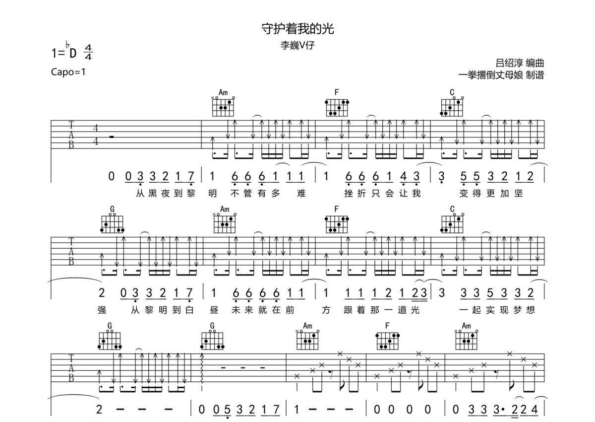 李巍V仔《守护着我的光》吉他谱 - C调弹唱六线谱