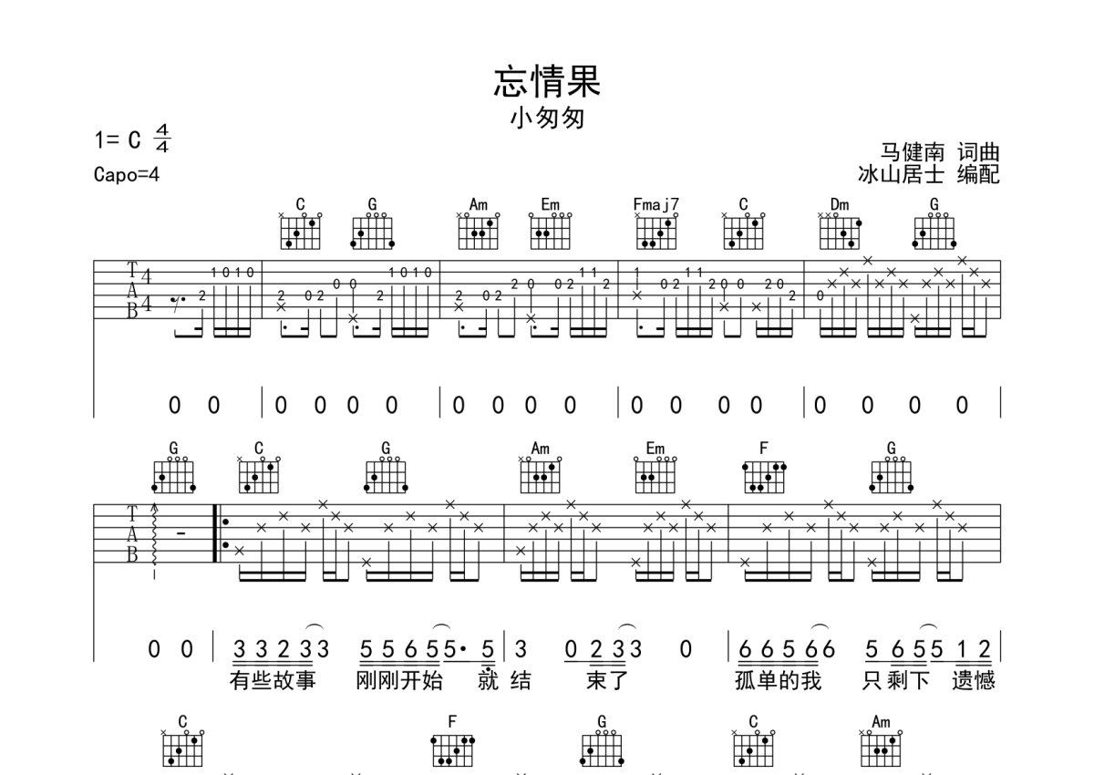 小匆匆《忘情果》吉他谱 - C调弹唱六线谱