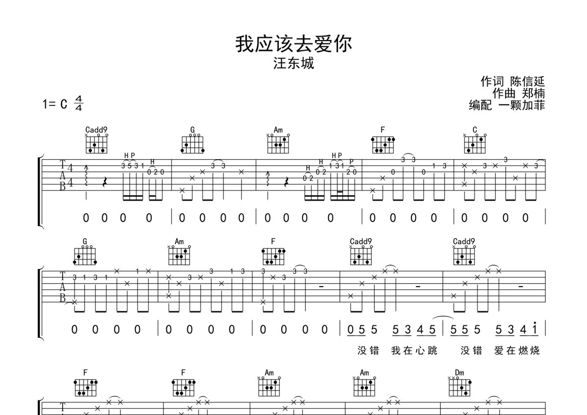 汪东城《我应该去爱你》吉他谱 - C调弹唱六线谱 - 完整编配版