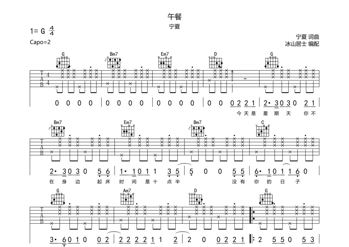 宁夏《午餐》吉他谱 - G调弹唱六线谱