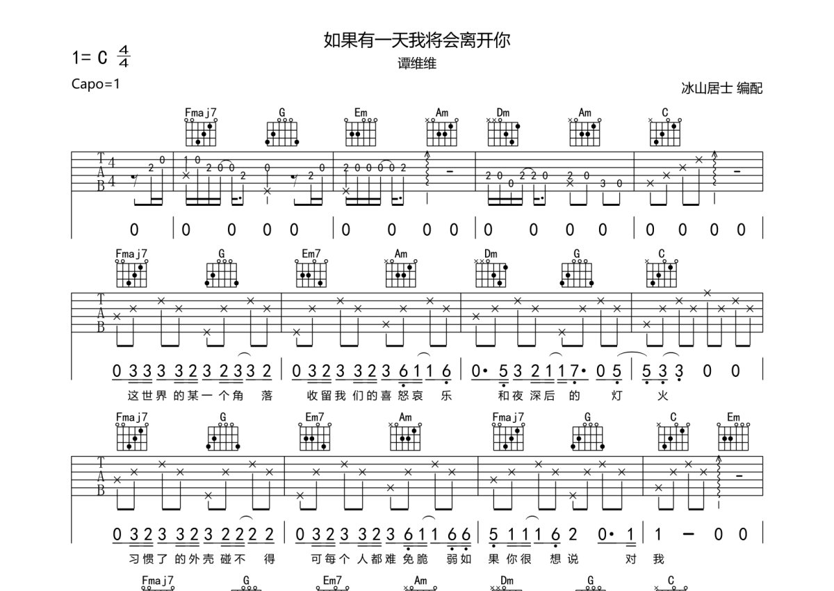 《如果有一天我将会离开你》是谭维维演唱的一首歌曲,本吉他谱采用的是C调指法编配,这份吉他谱共有两张高清图谱,图谱由 @冰山居士 编配上传,图谱使用六线谱编配,包含吉他和弦指法、简谱以及歌词部分,使用这份如果有一天我将会离开你吉他谱,可以让你更加方便地掌握这首歌曲的弹唱技巧,快来尝试吧。谭维维《如果有一天我将会离开你》吉他弹唱谱,采用C调指法编配,冰山居士编配出品,共有2张高清图谱,免翻页排版设计。