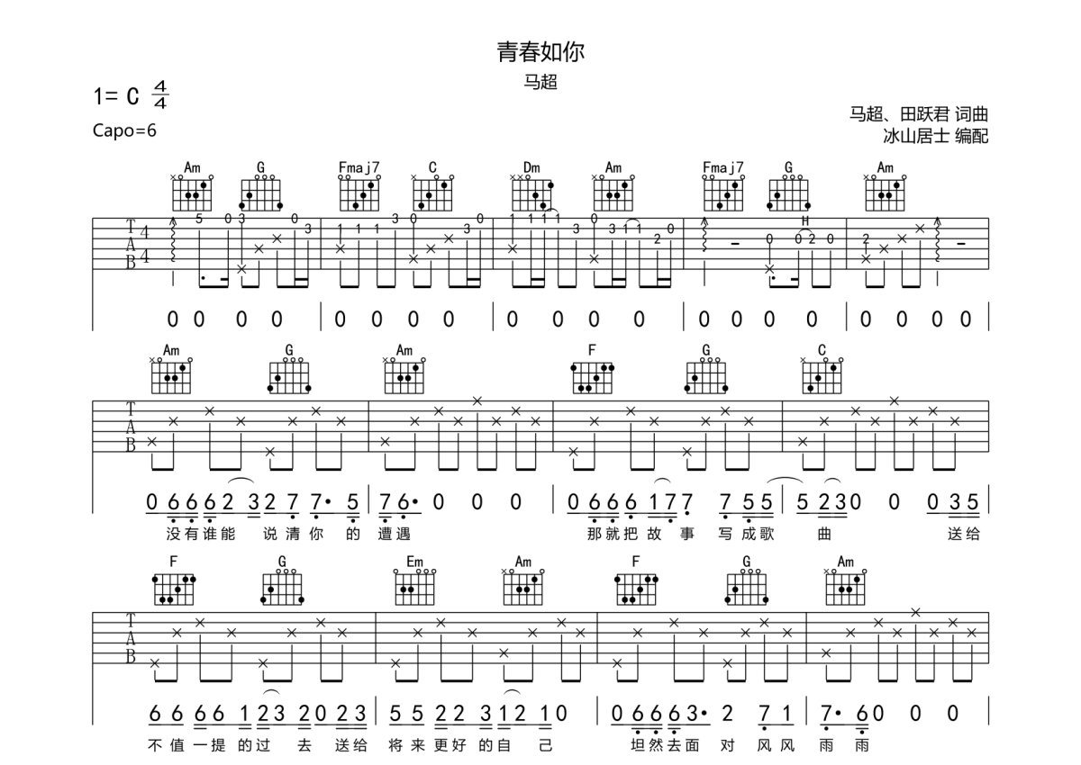 马超《青春如你》吉他谱 - C调弹唱六线谱