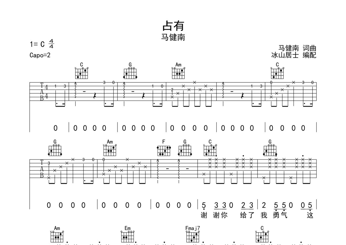 马健南《占有》吉他谱 - C调弹唱六线谱
