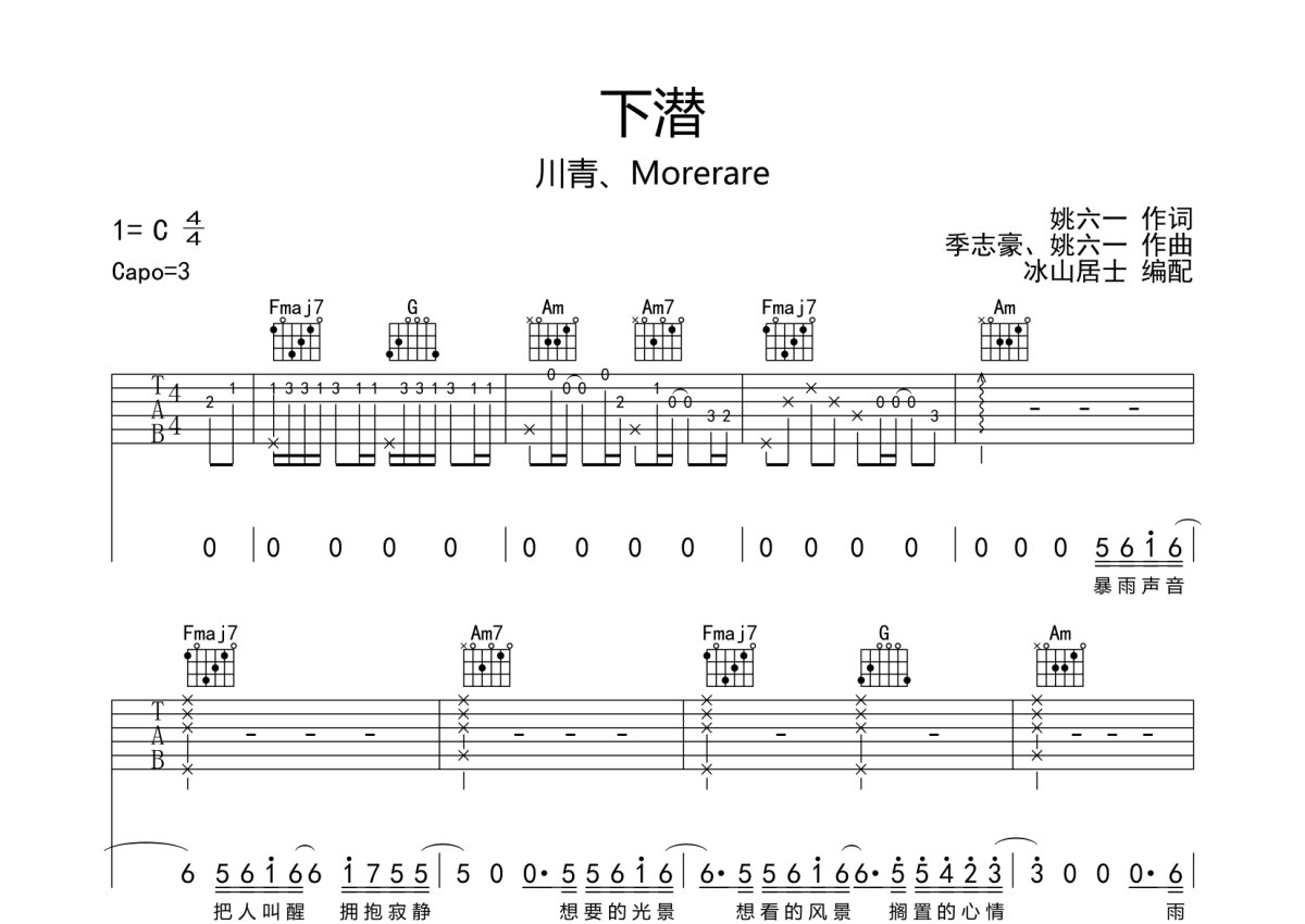 川青、Morerare《下潜》吉他谱 - C调弹唱六线谱