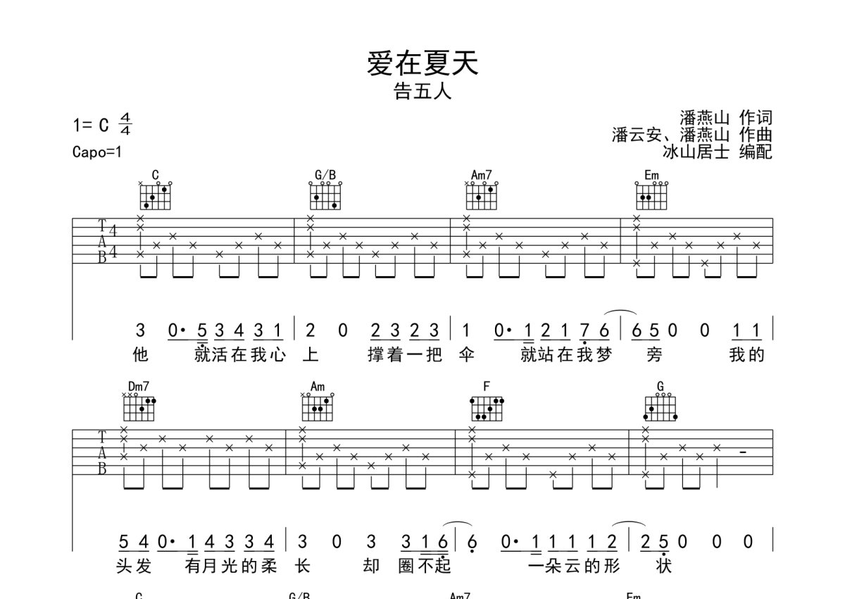 告五人《爱在夏天》吉他谱 - C调弹唱六线谱