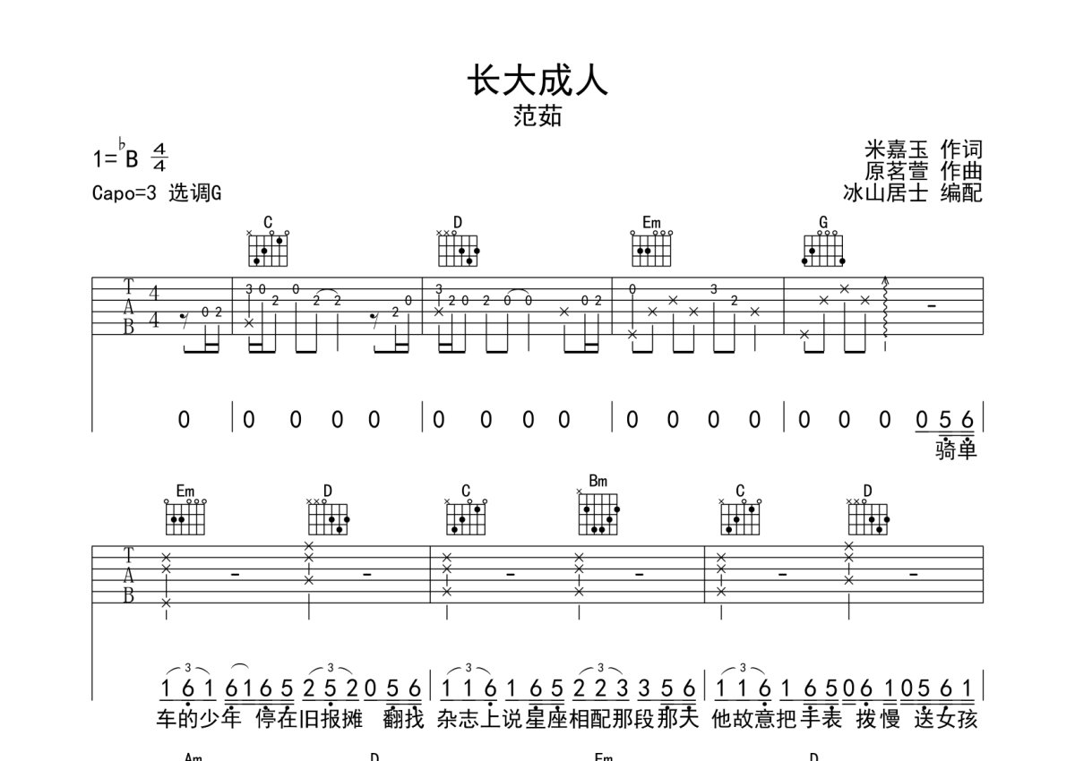 《长大成人》是范茹演唱的一首歌曲,本吉他谱采用的是G调指法编配,这份吉他谱共有三张高清图谱,图谱由 @冰山居士 编配上传,图谱使用六线谱编配,包含吉他和弦指法、简谱以及歌词部分,使用这份长大成人吉他谱,可以让你更加方便地掌握这首歌曲的弹唱技巧,快来尝试吧。范茹《长大成人》吉他弹唱谱,采用G调指法编配,冰山居士编配出品,共有3张高清图谱。