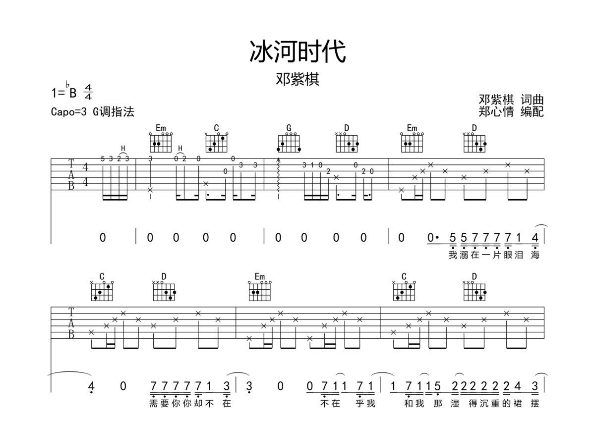 《冰河时代》是邓紫棋演唱的一首歌曲,本吉他谱采用的是G调指法编配,这份吉他谱共有四张高清图谱,图谱由 @冰山居士 编配上传,图谱使用六线谱编配,包含吉他和弦指法、简谱以及歌词部分,使用这份冰河时代吉他谱,可以让你更加方便地掌握这首歌曲的弹唱技巧,快来尝试吧。本谱选用G调指法编配,原调为降B调,变调夹夹第3品,也可以根据个人音域选择变调夹的位置。