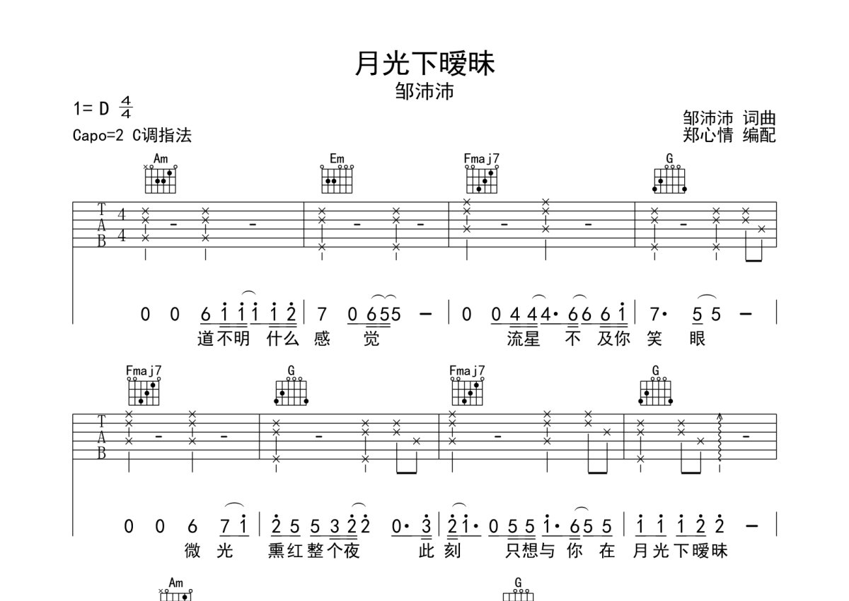 邹沛沛《月光下暧昧》吉他谱 - C调弹唱六线谱