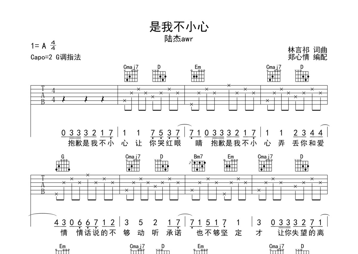 陆杰awr《是我不小心》吉他谱 - G调弹唱六线谱