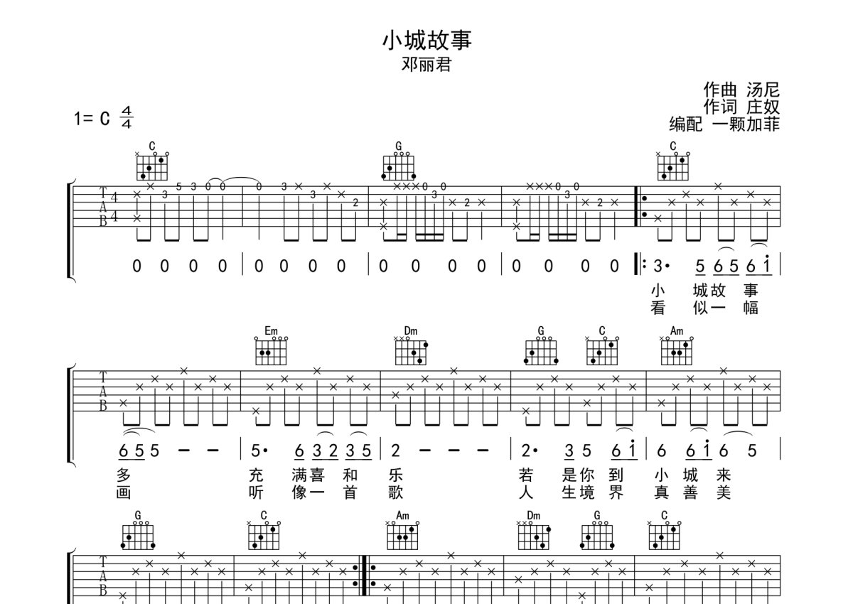 《小城故事》是邓丽君演唱的一首歌曲,完整编配版,本吉他谱采用的是C调指法编配,这份吉他谱共有两张高清图谱,图谱由 @一颗加菲 编配上传,图谱使用六线谱编配,包含吉他和弦指法、简谱以及歌词部分,曲谱配备了相关的音频提供试听,使用这份小城故事吉他谱,可以让你更加方便地掌握这首歌曲的弹唱技巧,快来尝试吧。