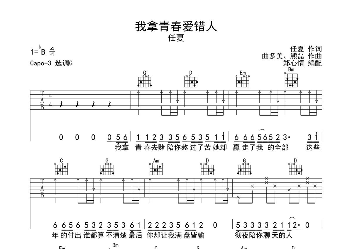 《我拿青春爱错人》是任夏演唱的一首歌曲,本吉他谱采用的是G调指法编配,这份吉他谱共有三张高清图谱,图谱由 @冰山居士 编配上传,图谱使用六线谱编配,包含吉他和弦指法、简谱以及歌词部分,使用这份我拿青春爱错人吉他谱,可以让你更加方便地掌握这首歌曲的弹唱技巧,快来尝试吧。我拿青春爱错人吉他谱,选用G调指法编配,原调为降B调,变调夹夹3品弹唱,也可以根据个人音高选择变调夹的位置。