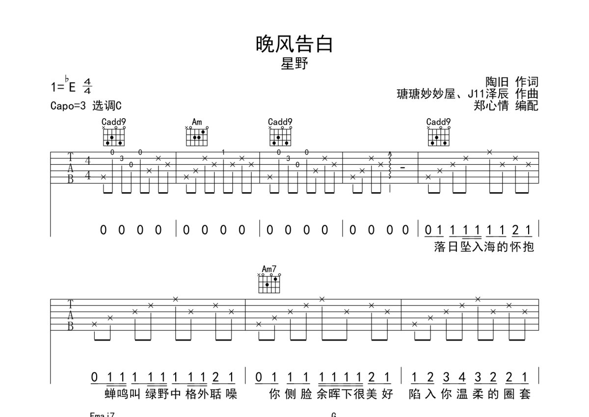 星野《晚风告白》吉他谱 - C调弹唱六线谱