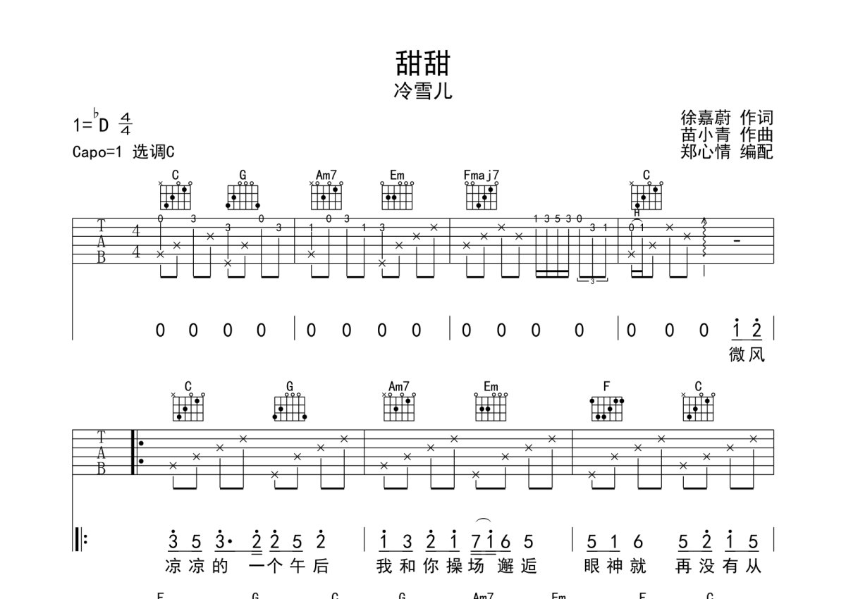 《甜甜》是冷雪儿演唱的一首歌曲,本吉他谱采用的是C调指法编配,这份吉他谱共有三张高清图谱,图谱由 @冰山居士 编配上传,图谱使用六线谱编配,包含吉他和弦指法、简谱以及歌词部分,曲谱配备了相关的音频提供试听,使用这份甜甜吉他谱,可以让你更加方便地掌握这首歌曲的弹唱技巧,快来尝试吧。甜甜吉他谱,曲谱选用C调指法编配,原调为降D调,变调夹夹1品弹唱。也可以根据个人音高选择变调夹的位置。歌曲由冷雪儿演唱,甜美的旋律,配上冷雪儿空灵的嗓音,一幅温暖而幸福的画面浮现眼前:牵着你的手,带着我的小梦想,走遍整个地球,你保护我,我迷恋你,这大概就是爱情最美好的样子吧。