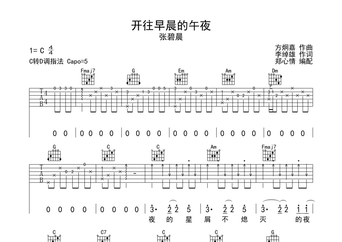 张碧晨《开往早晨的午夜》吉他谱 - C调弹唱六线谱