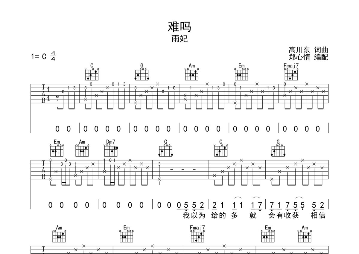 雨妃《难吗》吉他谱 - C调弹唱六线谱