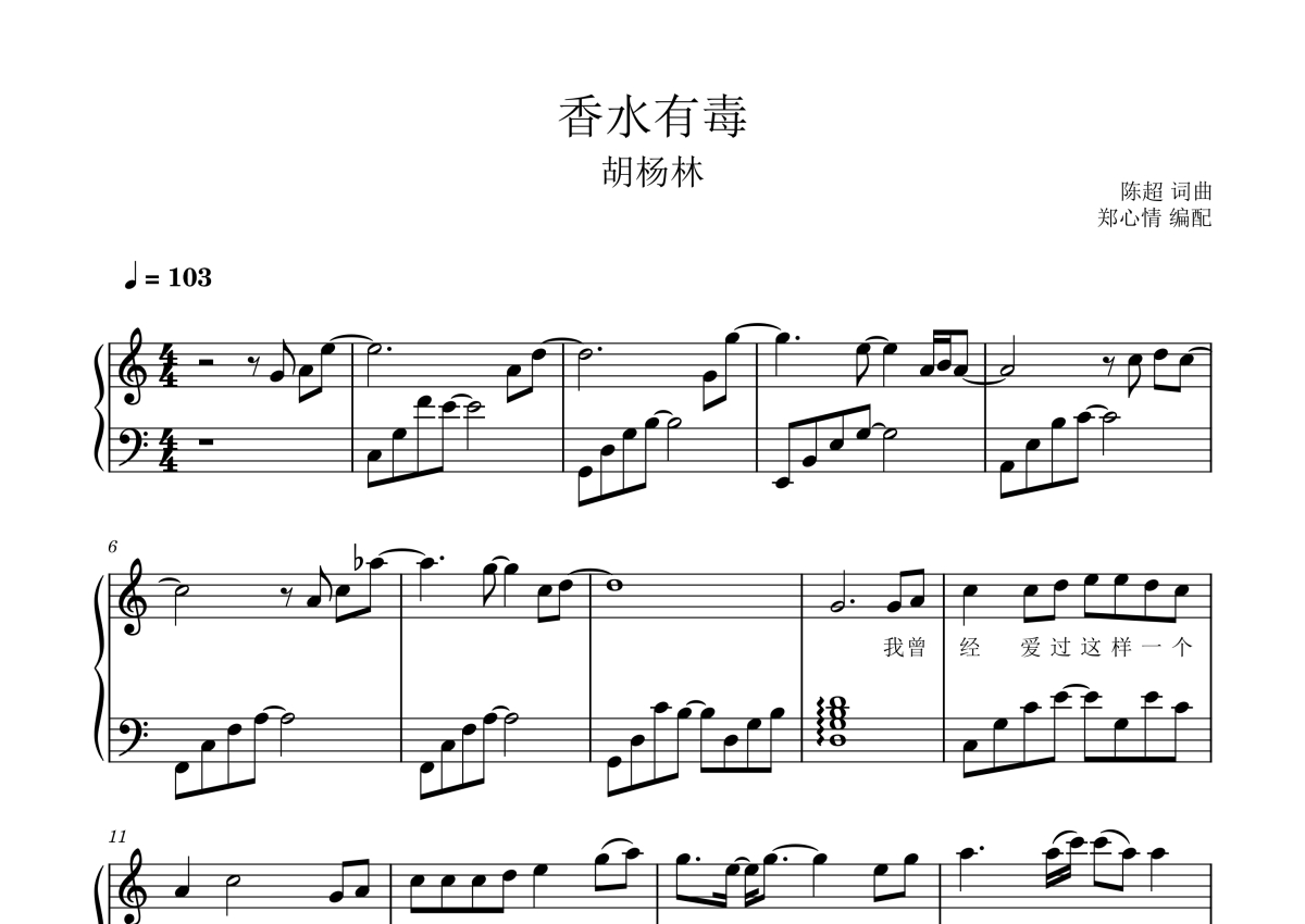 《香水有毒》是胡杨林演唱的一首歌曲,这份钢琴谱共有四张高清图谱,图谱由 @冰山居士 编配上传,曲谱配备了相关的音频提供试听,使用这份香水有毒钢琴谱,可以让你更加方便地掌握这首歌曲的演奏技巧,快来尝试吧。胡杨林《香水有毒》,冰山居士编配出品,共有4张高清图谱。