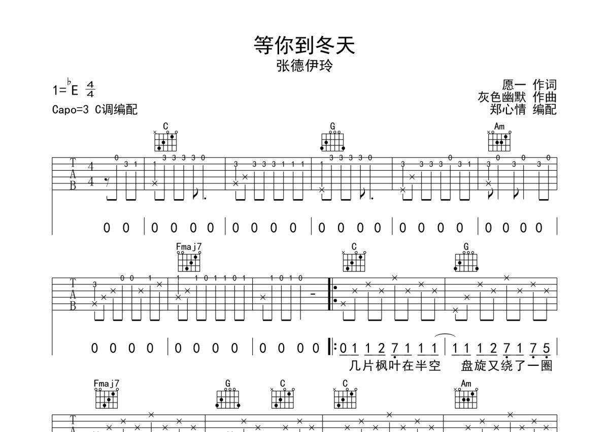张德伊玲《等你到冬天》吉他谱 - C调弹唱六线谱