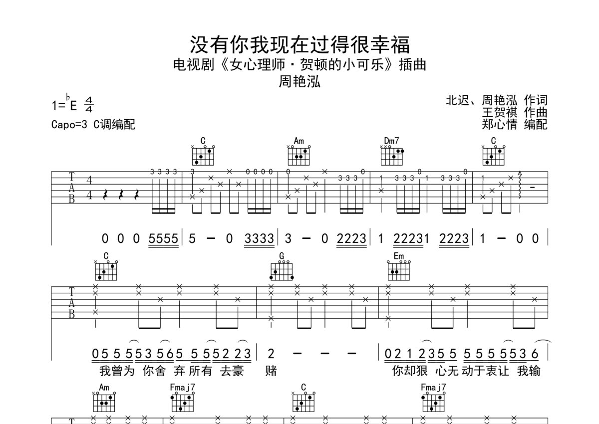 《没有你我现在过得很幸福》是周艳泓演唱的一首歌曲,本吉他谱采用的是C调指法编配,这份吉他谱共有三张高清图谱,图谱由 @冰山居士 编配上传,图谱使用六线谱编配,包含吉他和弦指法、简谱以及歌词部分,曲谱配备了相关的音频提供试听,使用这份没有你我现在过得很幸福吉他谱,可以让你更加方便地掌握这首歌曲的弹唱技巧,快来尝试吧。没有你我现在过得很幸福吉他谱,周艳泓演唱,电视剧《女心理师——贺顿的小可乐》插曲,选用C调指法编配,原调为降E调,变调夹夹3品弹唱,也可以根据个人音高调整变调夹的位置。示范音频为C调。