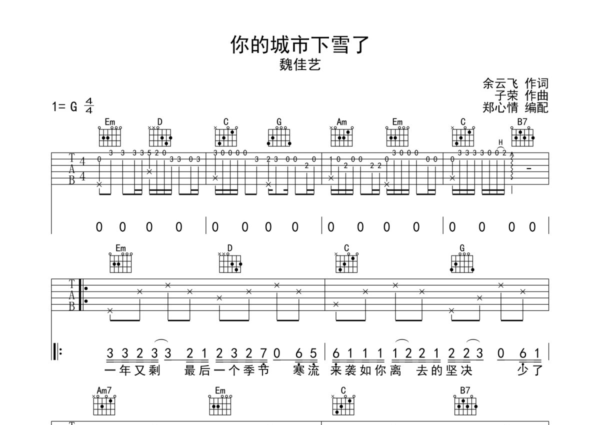 魏佳艺《你的城市下雪了》吉他谱 - C调弹唱六线谱