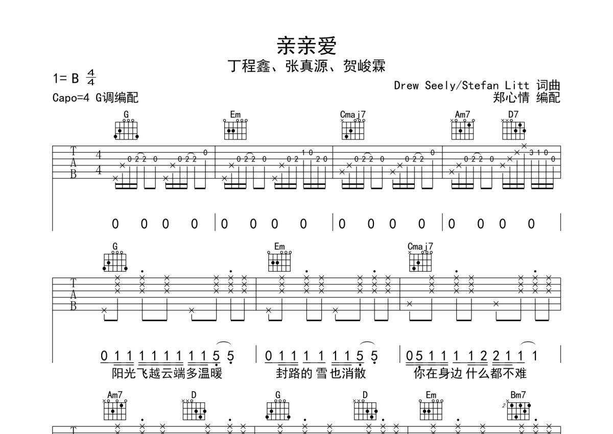 《亲亲爱》是丁程鑫、张真源、贺峻霖演唱的一首歌曲,本吉他谱采用的是G调指法编配,这份吉他谱共有四张高清图谱,图谱由 @冰山居士 编配上传,图谱使用六线谱编配,包含吉他和弦指法、简谱以及歌词部分,曲谱配备了相关的音频提供试听,使用这份亲亲爱吉他谱,可以让你更加方便地掌握这首歌曲的弹唱技巧,快来尝试吧。亲亲爱吉他谱,由丁程鑫、张真源、贺峻霖演唱,本谱选用G调指法编配,原调为B调,变调夹夹4品弹奏,也可以根据个人音高选择变调夹的位置。示范音频为G调。