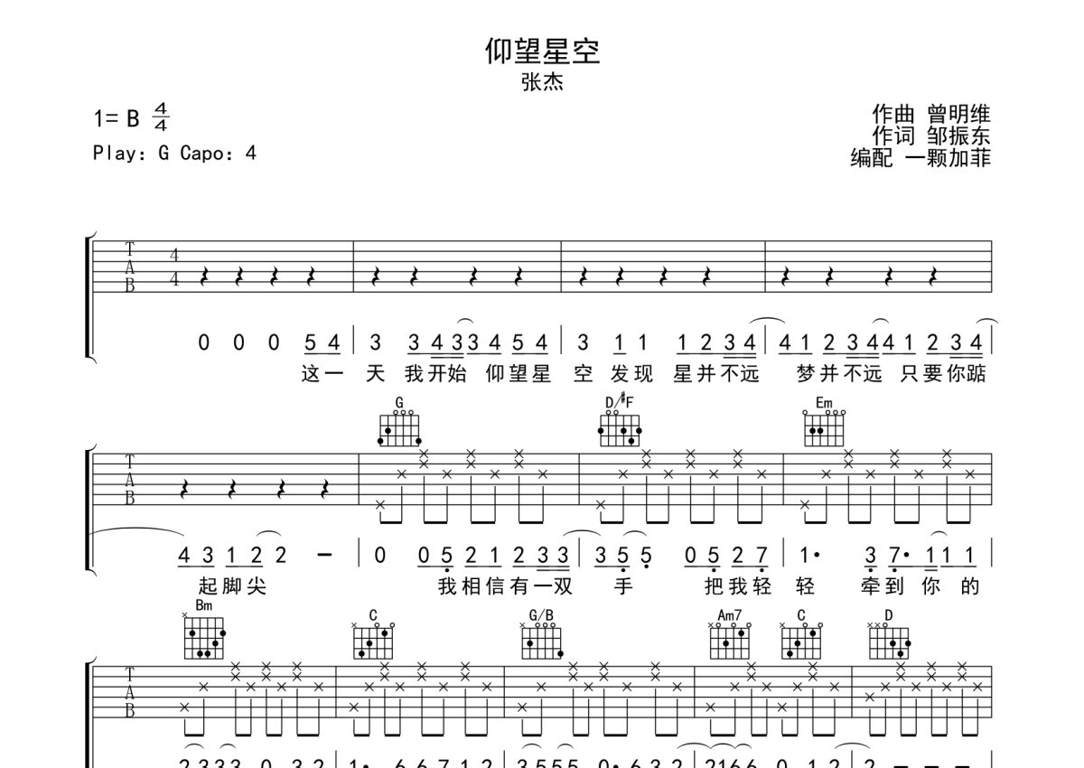 张杰《仰望星空》吉他谱 - G调弹唱六线谱 - 完整编配版