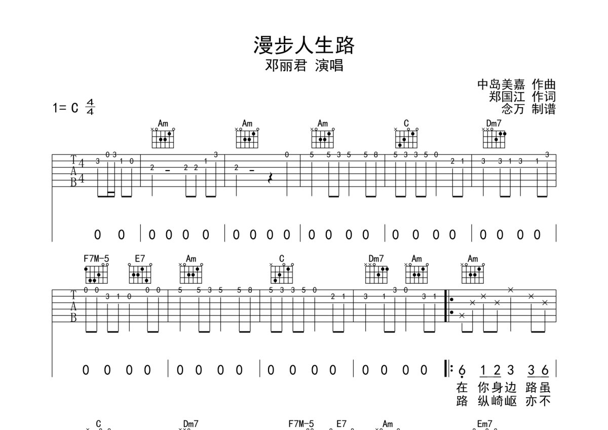 邓丽君《漫步人生路》吉他谱 - C调弹唱六线谱