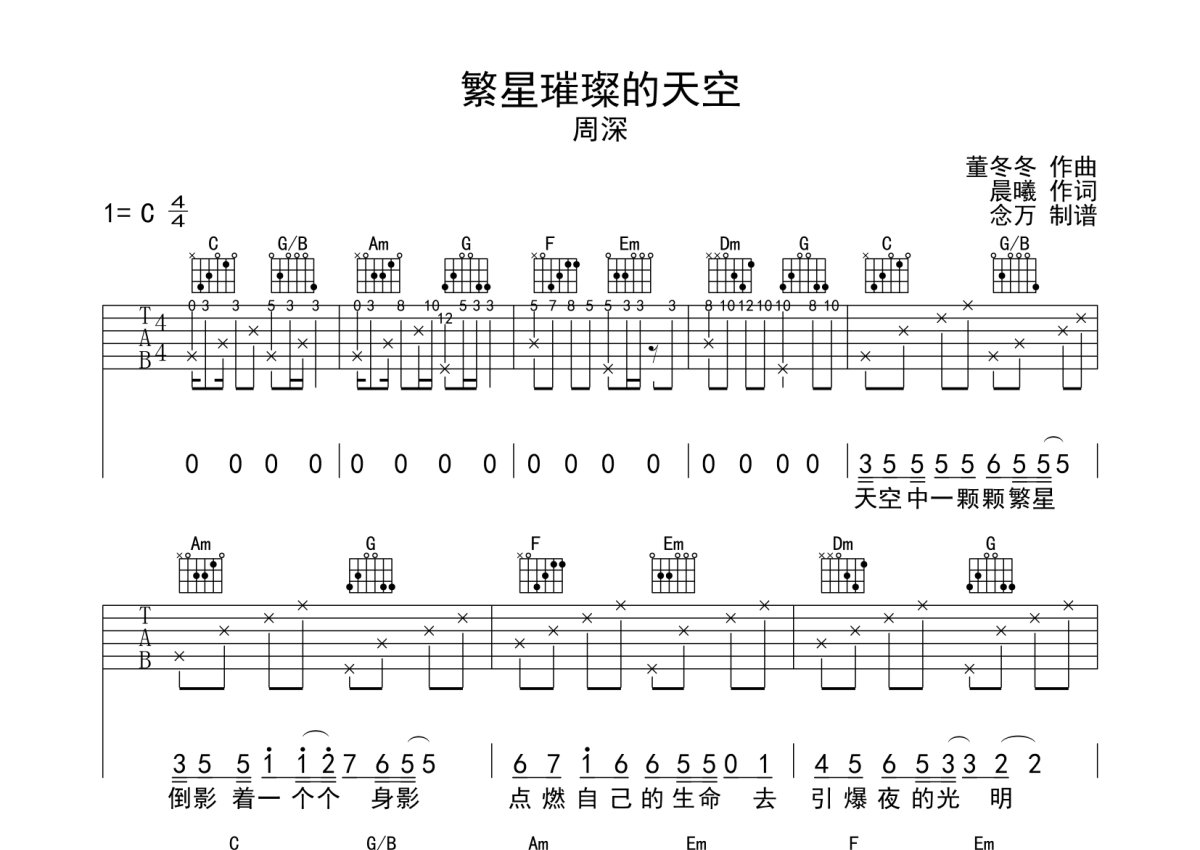 周深《繁星璀璨的天空》吉他谱 - C调弹唱六线谱
