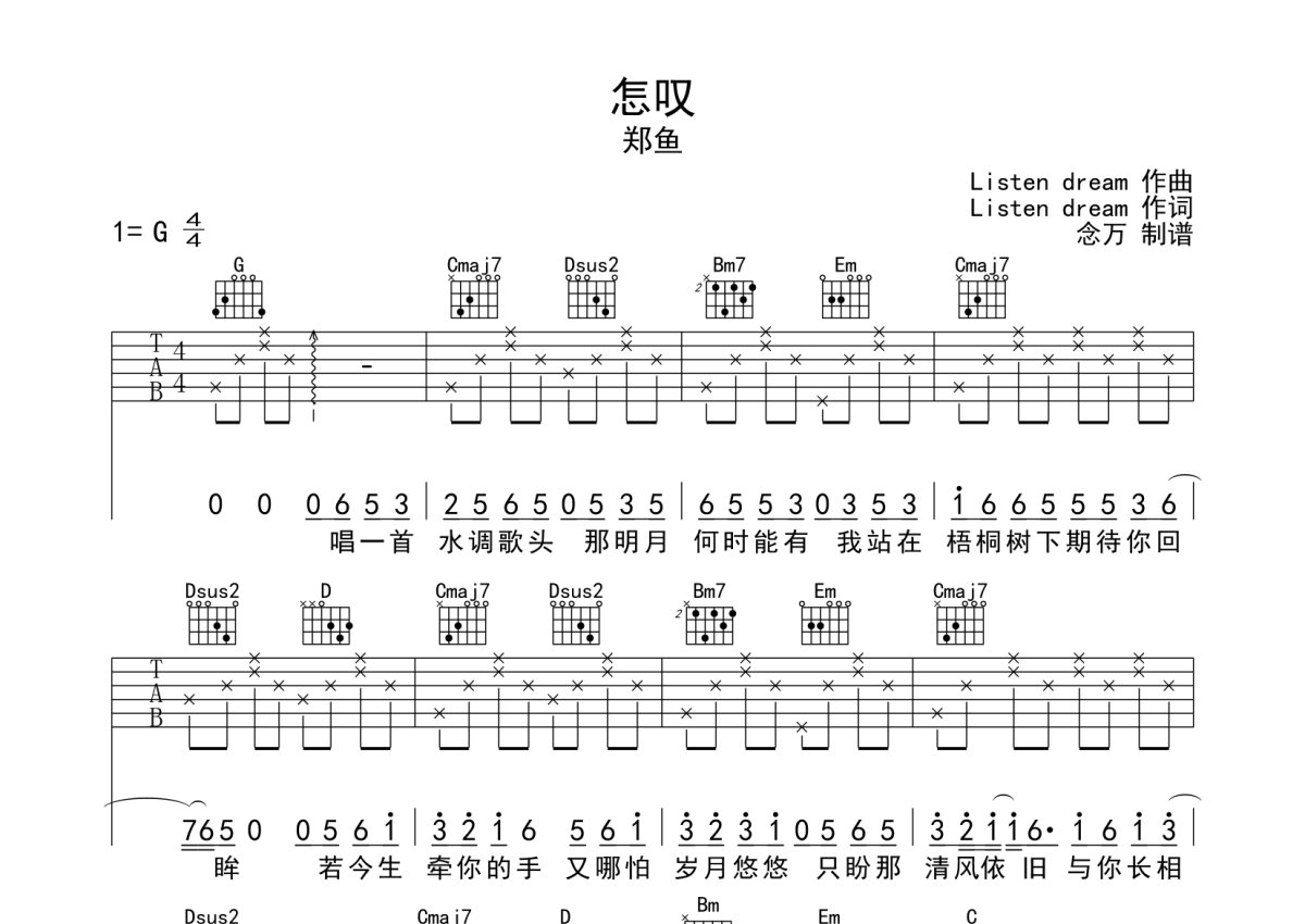 郑鱼《怎叹》吉他谱 - G调弹唱六线谱