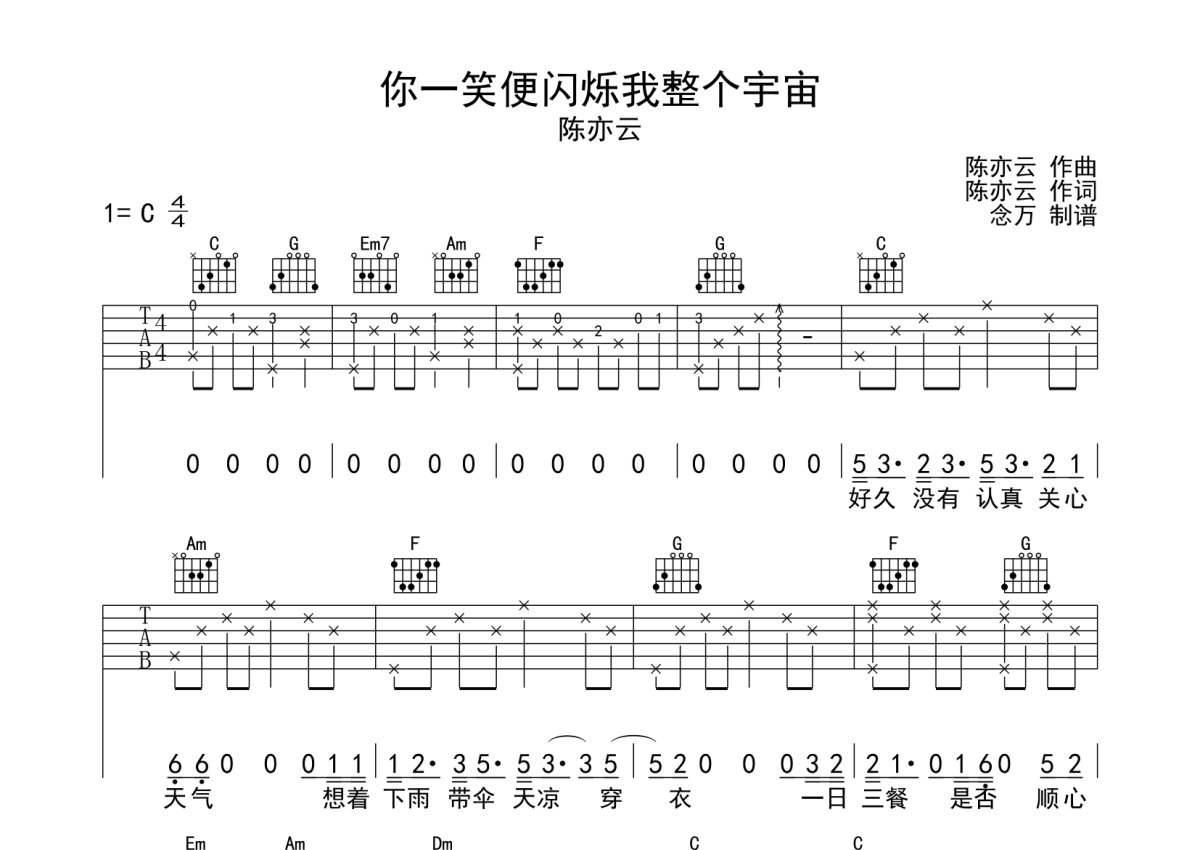 陈亦云《你一笑便闪烁我整个宇宙》吉他谱 - C调弹唱六线谱