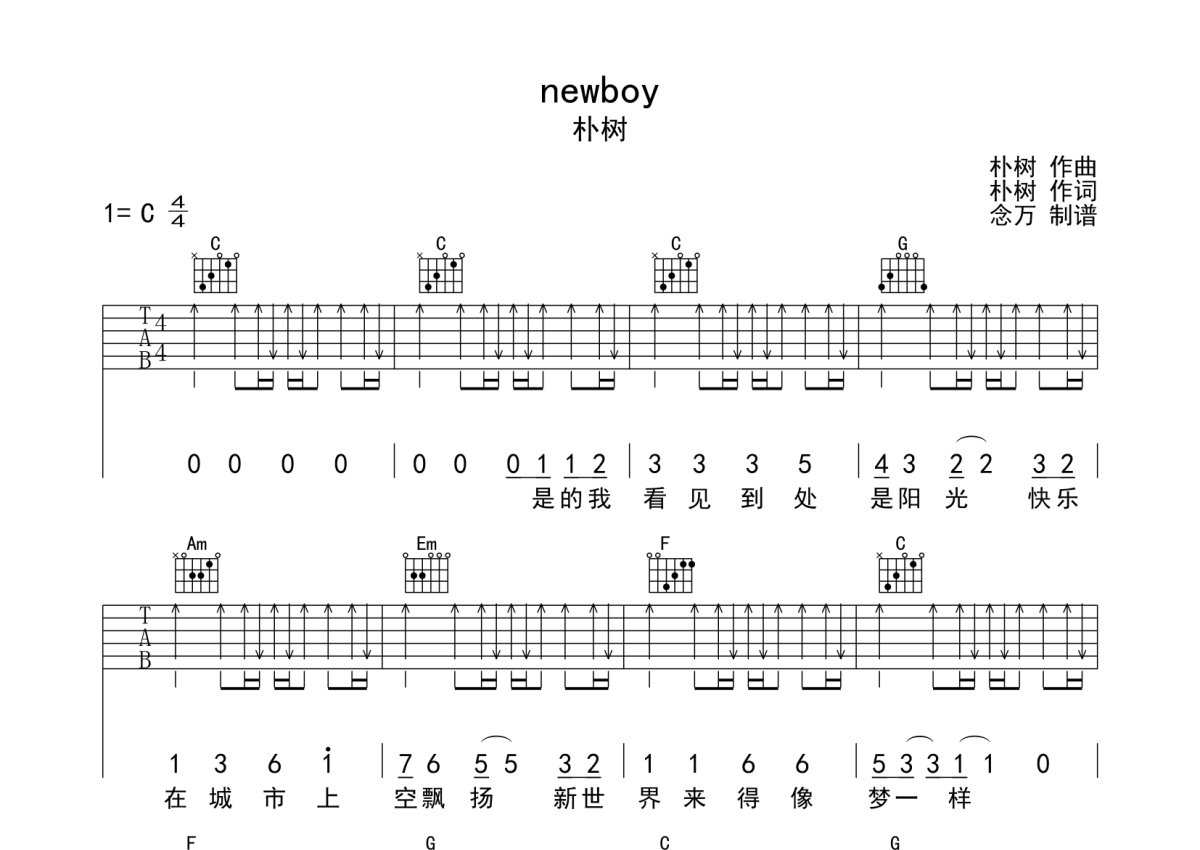 朴树《newboy》吉他谱 - C调弹唱六线谱