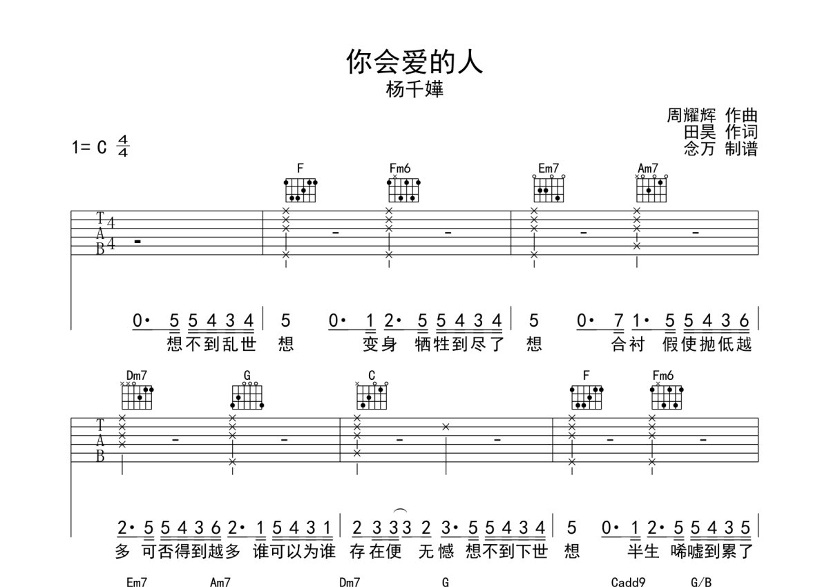 《你会爱的人》是杨千嬅演唱的一首歌曲,本吉他谱采用的是C调指法编配,这份吉他谱共有四张高清图谱,图谱由 @念万 编配上传,图谱使用六线谱编配,包含吉他和弦指法、简谱以及歌词部分,使用这份你会爱的人吉他谱,可以让你更加方便地掌握这首歌曲的弹唱技巧,快来尝试吧。杨千嬅《你会爱的人》吉他谱_C调吉他弹唱谱。