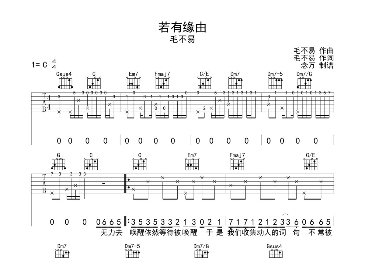 毛不易《若有缘由》吉他谱 - C调弹唱六线谱