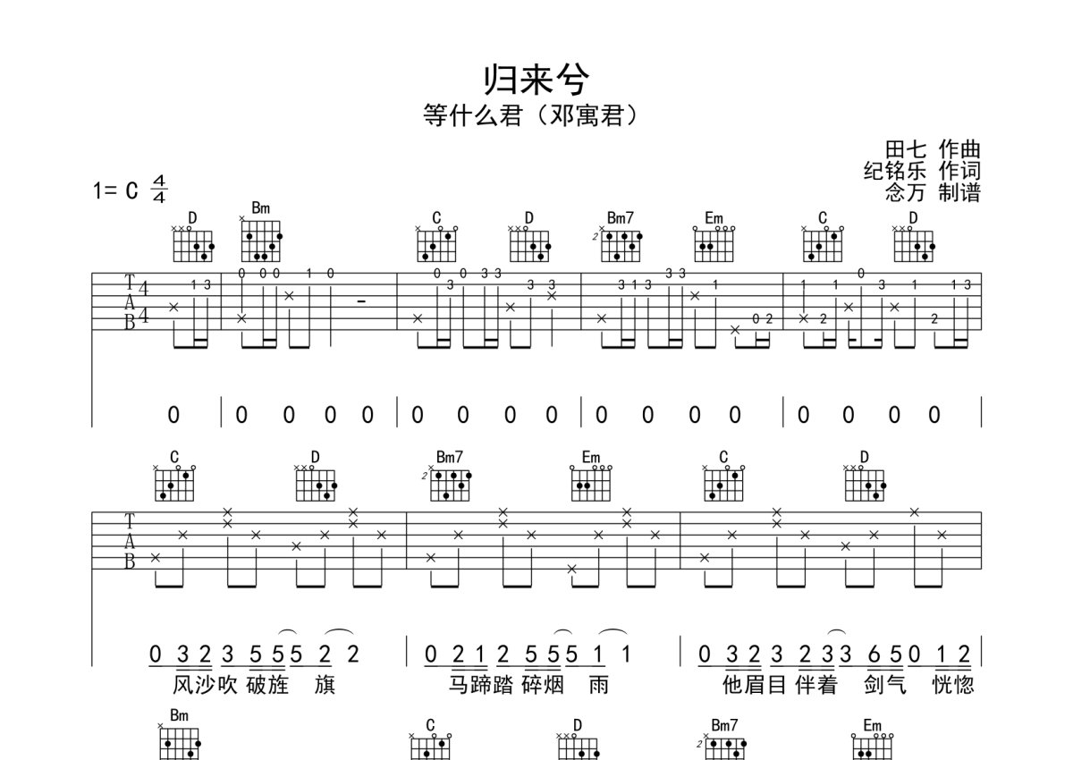 等什么君/邓寓君《归来兮》吉他谱 - C调弹唱六线谱