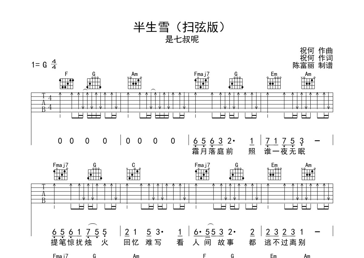 是七叔呢《半生雪》吉他谱 - G调弹唱六线谱 - 扫弦版