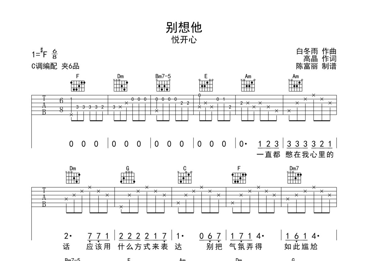 悦开心《别想他》吉他谱 - C调弹唱六线谱