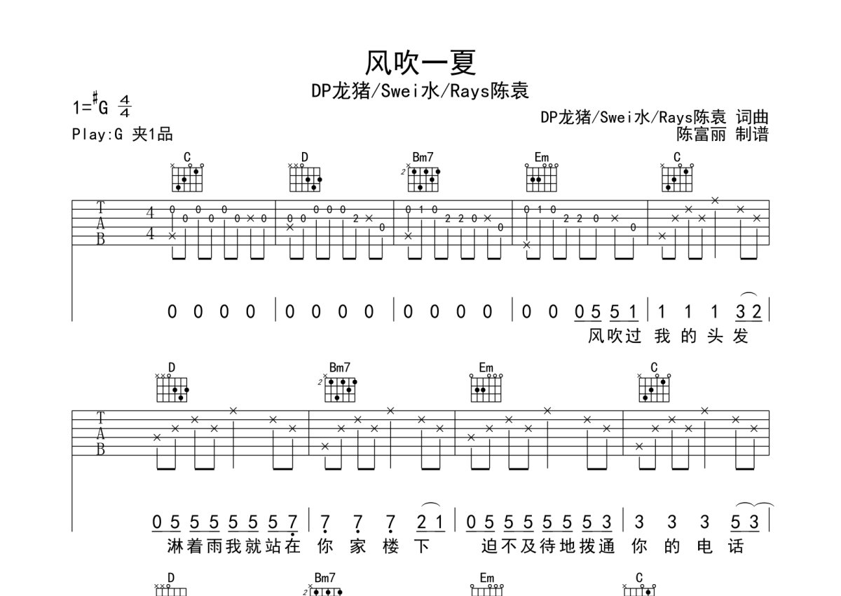 DP龙猪/Swei水/Rays陈袁《风吹一夏》吉他谱 - G调弹唱六线谱
