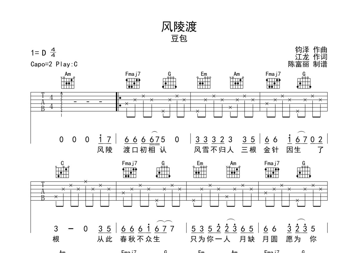 豆包《风陵渡》吉他谱 - C调弹唱六线谱