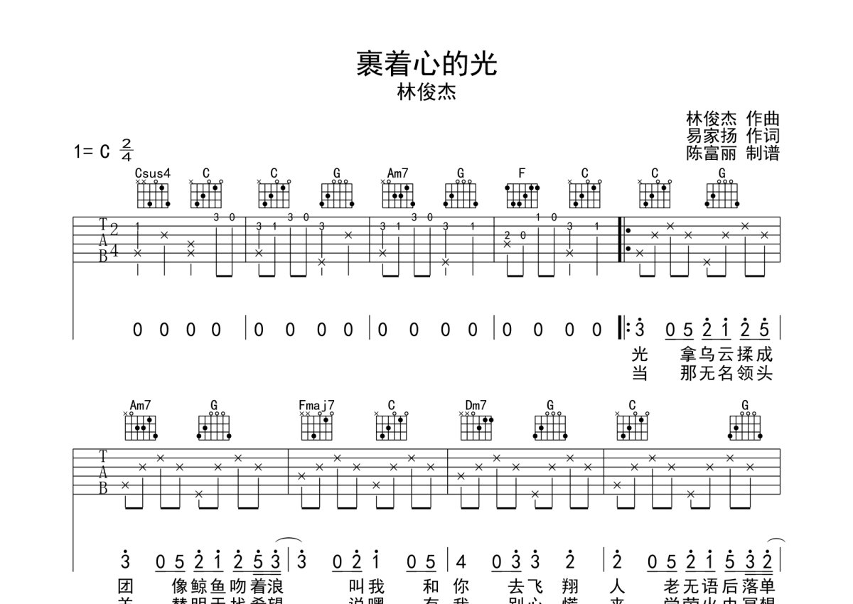 林俊杰《裹着心的光》吉他谱 - C调弹唱六线谱